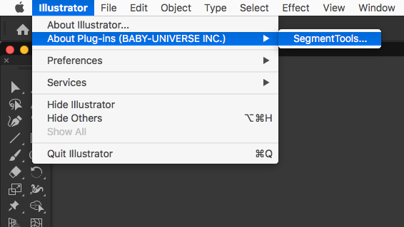 Open Adobe Illustrator and show “About Plug-ins (BABY-UNIVERSE INC.)” in the Illustrator menu (Help menu on Windows.)