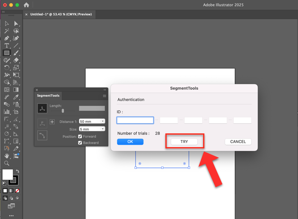 2. When you select a plug-in tool or menu item installed in Illustrator, a dialog like the one shown below ( authentication dialog ) will appear. Please enter your serial number to the boxes and click “OK”.